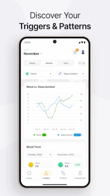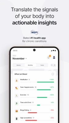 Uz Effecto, svaki vaš unos postaje deo moćne analize koja otkriva veze koje biste inače propustili. Pametni algoritmi aplikacije generišu vizuelne izveštaje koji pokazuju kako se različiti faktori međusobno prepliću. Pratite korelacije između simptoma, raspoloženja i navika, i posmatrajte prepoznavanje obrazaca tokom nedelja i meseci. Na osnovu ovih podataka, Effecto vam pruža akcione preporuke za poboljšanje vaše svakodnevne rutine. Aplikacija je dizajnirana da podrži preko 200 zdravstvenih stanja, što je čini idealnom za praćenje hroničnog bola, simptoma ADHD-a, bipolarnog poremećaja, anksioznosti i depresije, autoimunih stanja, poremećaja spavanja i probave, kao i bilo kog stanja koje zahteva detaljne dnevnike simptoma.