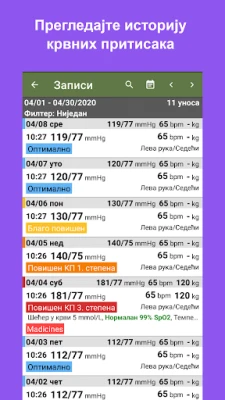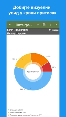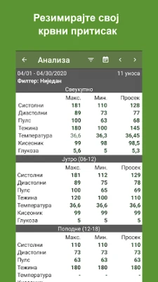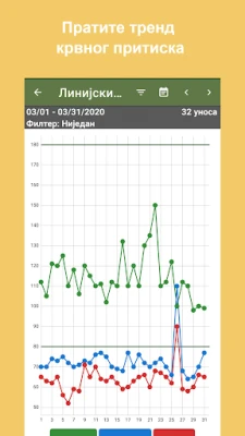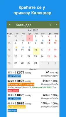 Уз помоћ интуитивног календара, лако ћете прегледати и уносити своје записе, осигуравајући да ниједан податак не буде изгубљен. Апликација аутоматски израчунава категорије крвног притиска, омогућавајући вам да брзо схватите тренутну ситуацију. Можете пратити трендове путем прегледних линијских графикона, који визуелно представљају кретање ваших вредности током времена. За дубљи увид, овај систем резимира максималне, минималне и просечне вредности, док флексибилно означавање података омогућава њихову ефикасну организацију и брзо проналажење. Све ове функције заједно чине незаменљив ресурс за континуирано праћење и контролу вашег здравственог стања.